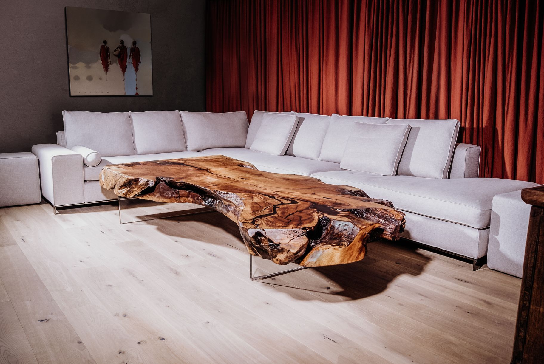 Einzigartiger Designer Couchtisch aus einem Baumstamm mit exklusiver Maserung aus Kirsche von Stammdesign