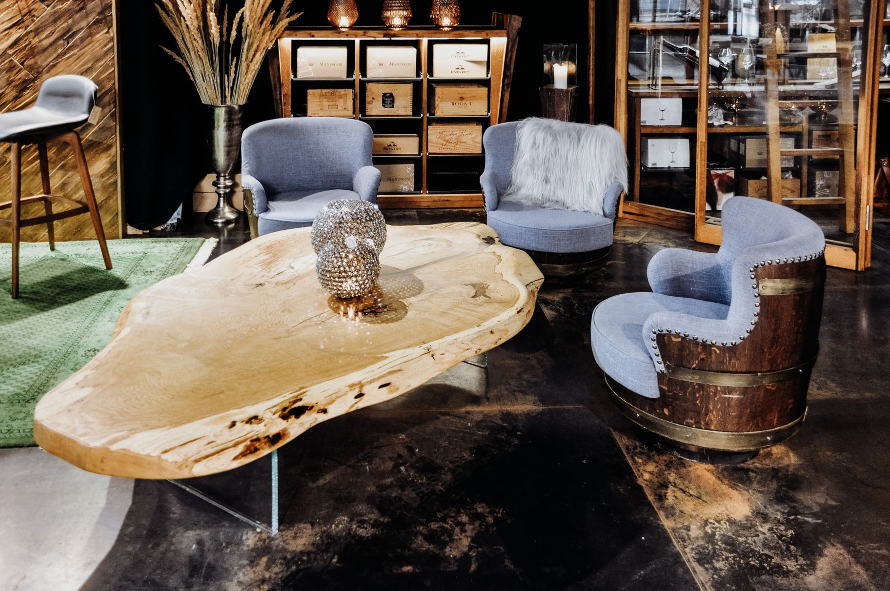 Massiver Couchtisch aus einem Baumstamm mit Naturholz Tischplatte aus Eiche