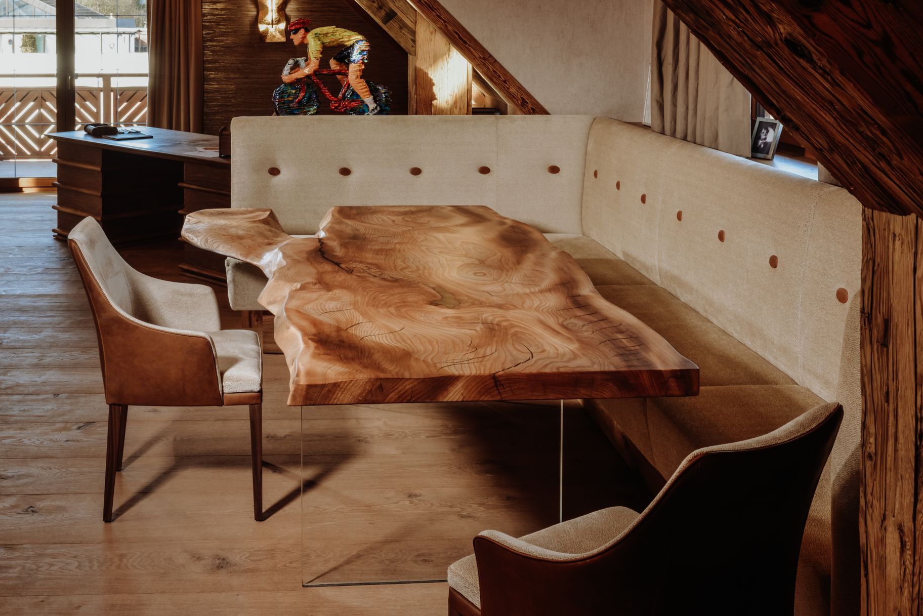 Exklusiver Designer-Esstisch aus einem Baumstamm mit Naturholz-Tischplatte aus Rüster, Ansicht FrontExklusiver Designer-Esstisch aus einem Baumstamm mit Naturholz-Tischplatte aus Rüster, Ansicht Seite