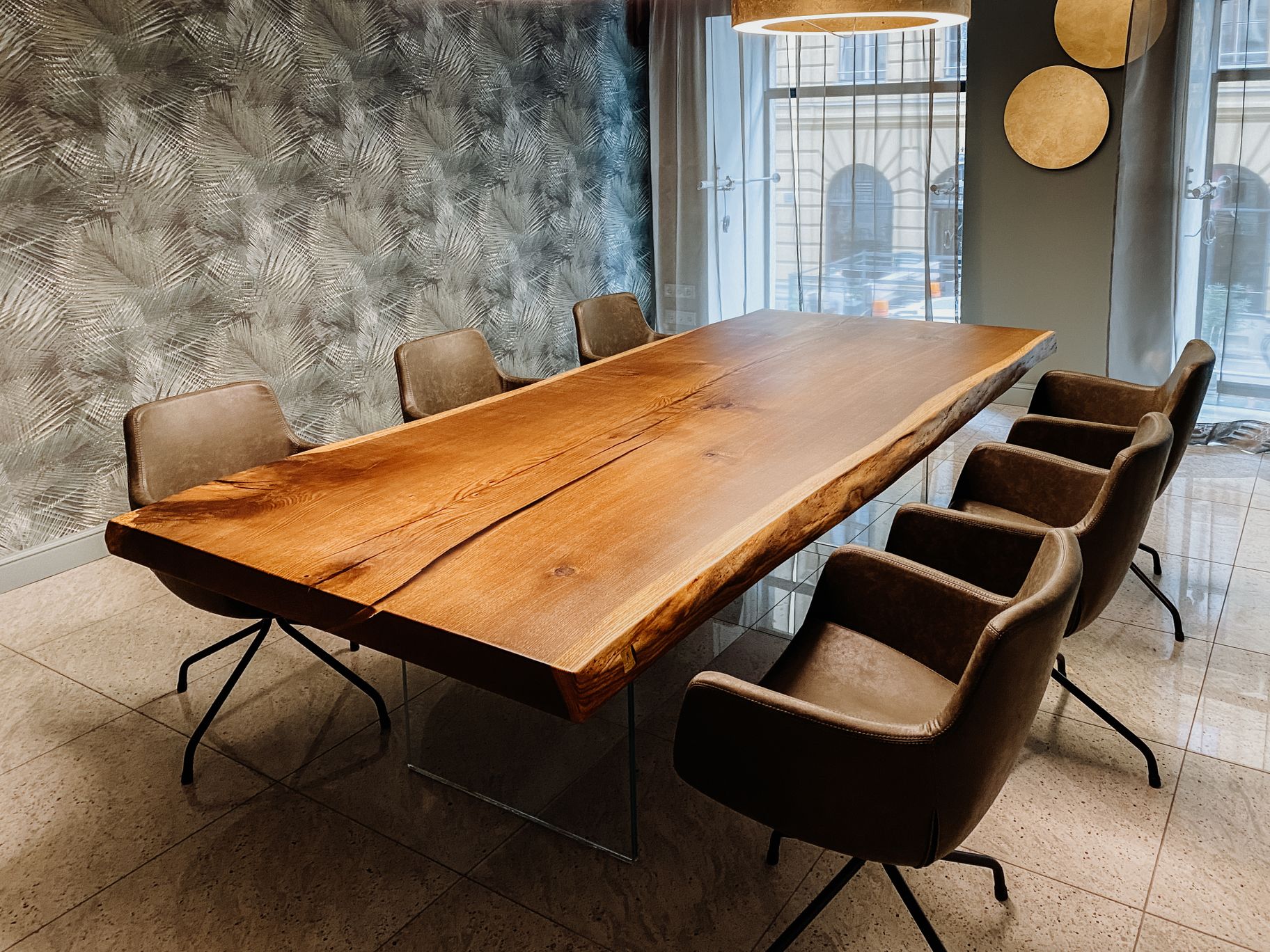 Modern designer tree stump table with glass legs and solid oak wood tabletop by Stammdesign.Modern designer tree stump table with glass legs and solid oak wood tabletop by Stammdesign.Modern designer tree trunk table with glass legs and solid oak wood tabletop.Modern designer tree stump table with glass legs and solid oak wood tabletop by Stammdesign.