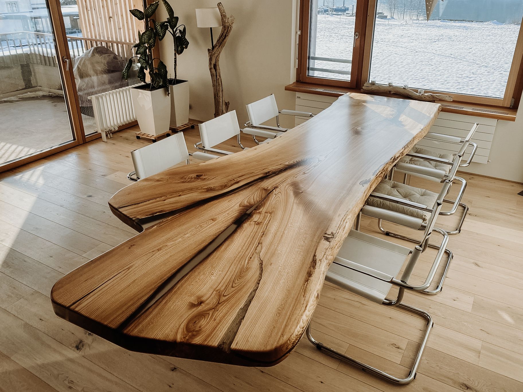 Solid real wood table with glass legs, crafted from a tree trunk by Stammdesign, made of elm.