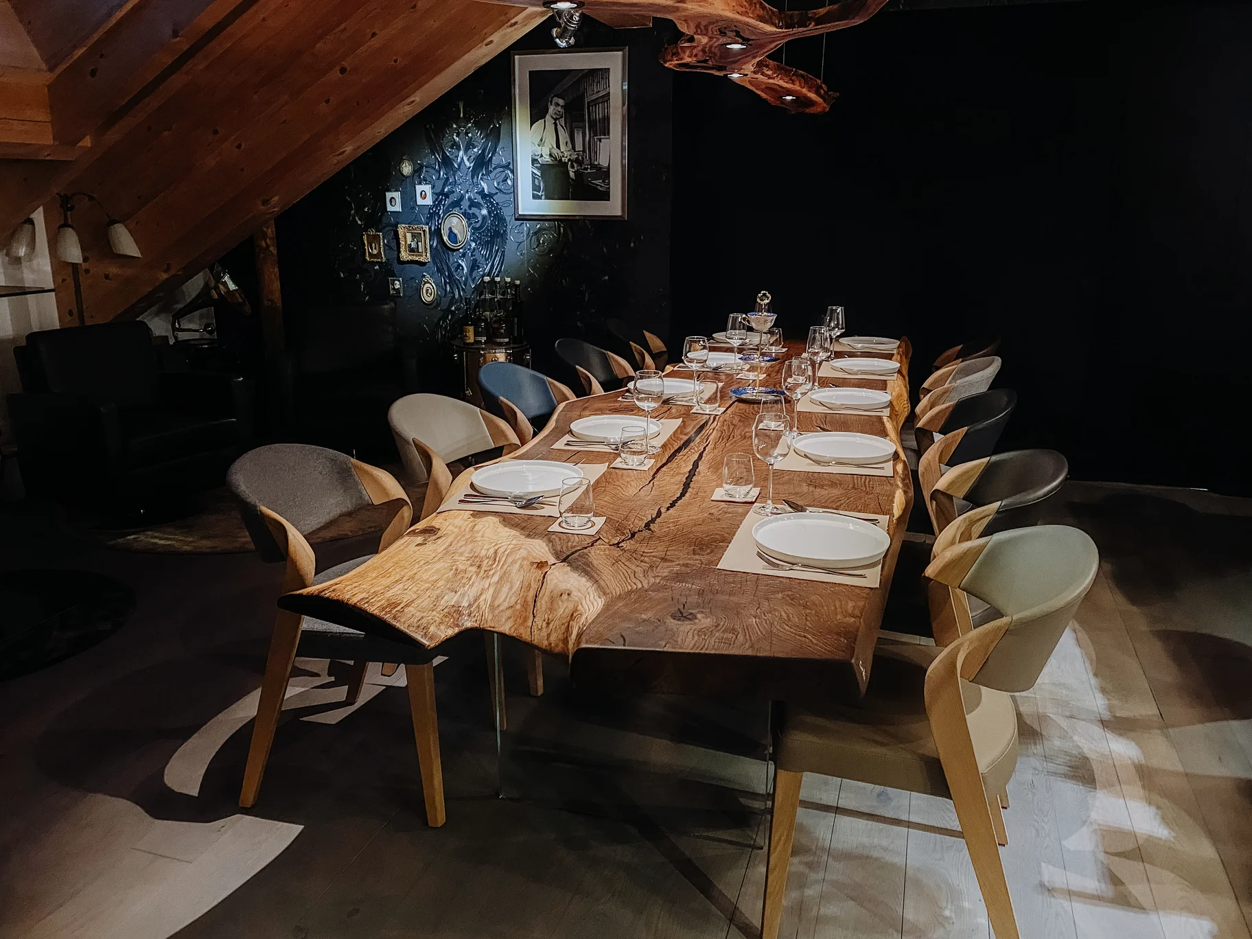 Table design exclusive en tronc d’arbre avec plateau en chêne, vue frontale.Table design exclusive en tronc d’arbre avec plateau en chêne, vue frontale 2.Table design exclusive en tronc d’arbre avec plateau en chêne.