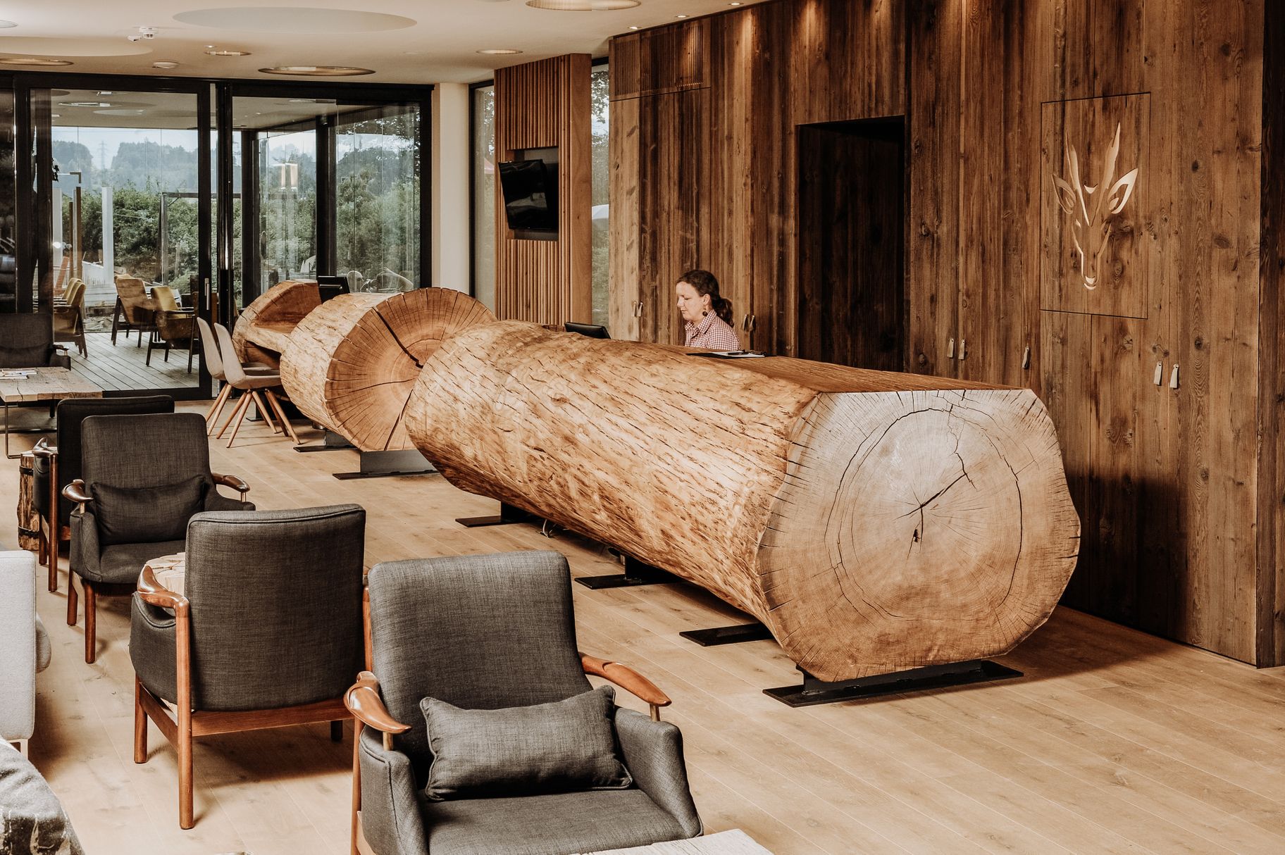 Dans l'entrée de l'hôtel, deux troncs d'arbre impressionnants servent de réceptions fonctionnelles. Fabriqués à la main à partir d'un tronc robuste unique, ils allient beauté naturelle et utilisation pratique. Leur forme puissante et accueillante s'intègre parfaitement à l'architecture de l'hôtel, créant un point focal unique. Ces réceptions en tronc d'arbre ne sont pas seulement un élément visuel frappant, mais aussi des éléments de design durables et exceptionnels qui laissent aux invités une première impression inoubliable.