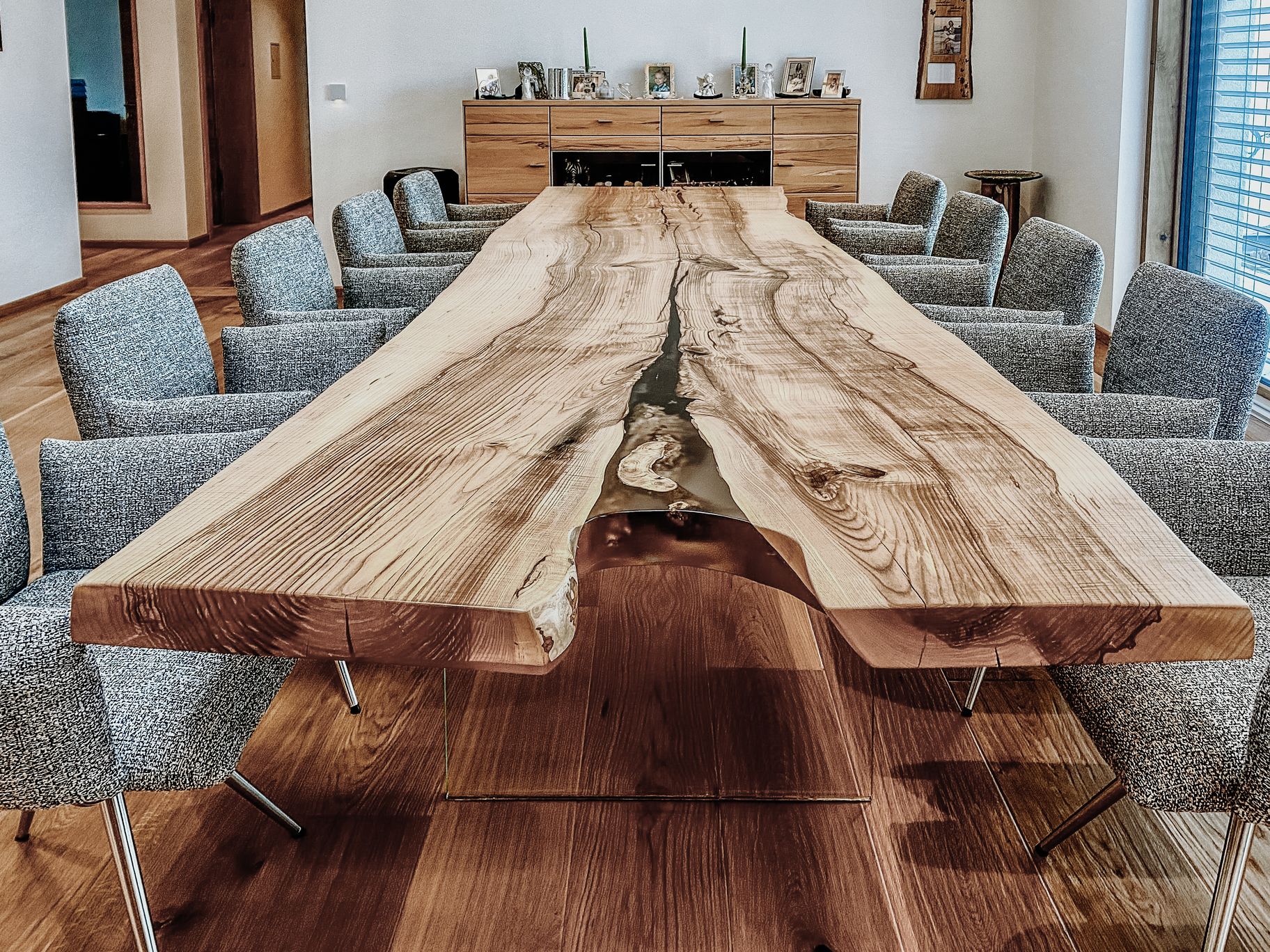 Tavolo da pranzo di alta qualità da un tronco con piano in legno massello di frassino, vista frontale.Tavolo da pranzo di alta qualità da un tronco con piano in legno massello di frassino.